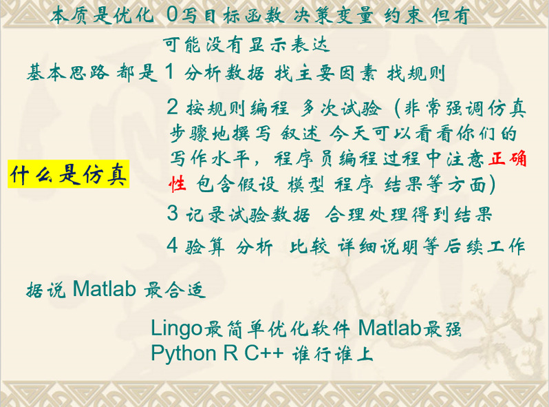 然后就建模竞赛中一个重要方法——模拟仿真进行了深入浅出的介绍。李波教授首先介绍了什么是模拟仿真方法。模拟仿真方法的核心思想是基于相似性原理,通过构建一个在某种程度上与真实系统相似的模型(可以是物理的或数学的),然后对模型进行实验,将实验结果推论到真实系统中,从而达到认识真实系统特性的目的。其基本流程包括模型构建,实验运行和结果分析。