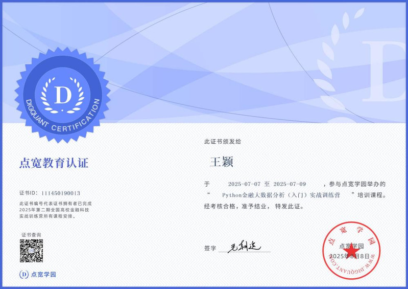 实训过程中,学生们表现出浓厚的学习兴趣和积极的实践态度。大家认真完成每日作业,主动探讨数据处理中遇到的问题,并在小组协作中不断提升团队沟通与项目组织能力。许多学生反馈,通过本次实训不仅加深了对Python在金融领域应用的理解,也更清晰认识到大数据分析在现代金融中的重要作用。顺利完成实训的学生还将获得“点宽学园”培训认证证书,为其未来职业发展增添有力凭证。此次实训有效实现了“学用结合、实战促学”的教学目标,为学生后续深造和就业奠定了坚实基础。