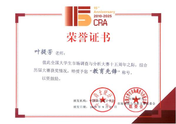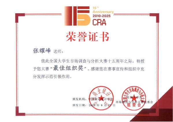会上,我院荣获全国大学生市场调查与分析大赛15周年“最佳组织奖”。张耀峰获评“最佳组织奖(个人)”,王磊获评“优秀导师”称号,曾霞、叶提芳获评“教育先锋”称号。