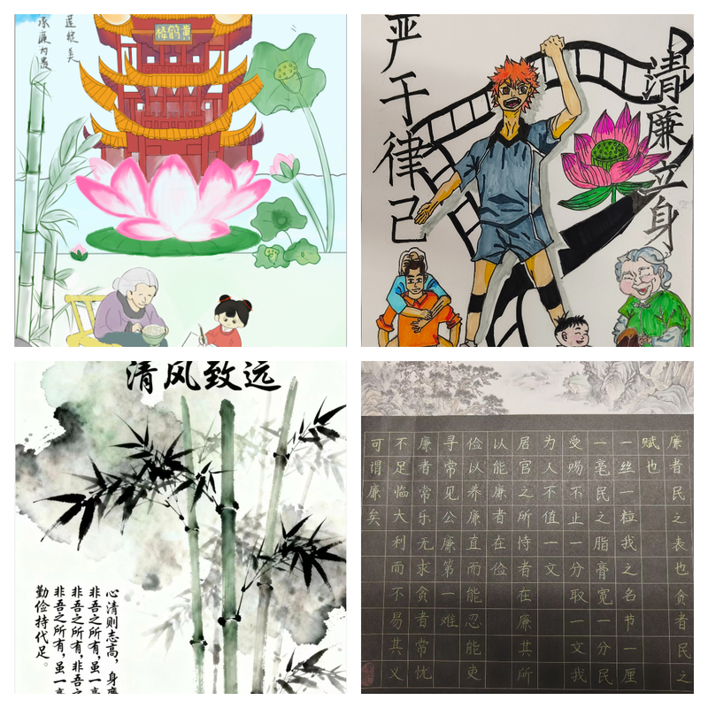 在“我家的清廉家规家训”作品征集活动中,参与者围绕“清廉家规家训”主题创作电子海报、漫画或书法等形式的文艺作品。同学们以书法、绘画、海报等多元形式,展现家乡特色与家庭文化,传递“清廉传家”的价值理念。该活动中共有8件作品获评优秀并在学院集中展示,成为校园中一道传递“廉能量”的风景线。