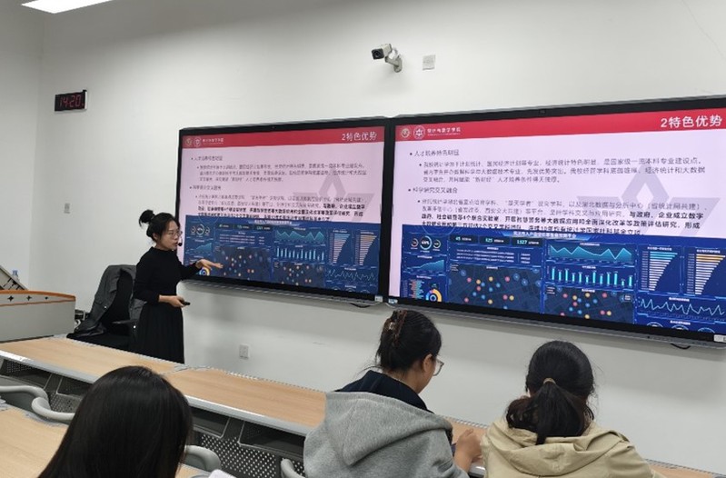 宣讲过程中,团队成员围绕学校办学特色、学院发展历程、应用统计硕士点优势等核心内容展开详细介绍。重点解读了硕士点两大研究方向——社会经济统计、大数据分析方法与应用的培养特色,展示了学院雄厚的师资力量、丰富的科研成果及产教融合优势。同时,针对考生关心的考试科目、复试安排、学制学费、奖助体系等关键问题,宣讲教师结合学校研究生奖助政策进行精准答疑,并分享备考经验与择校建议。