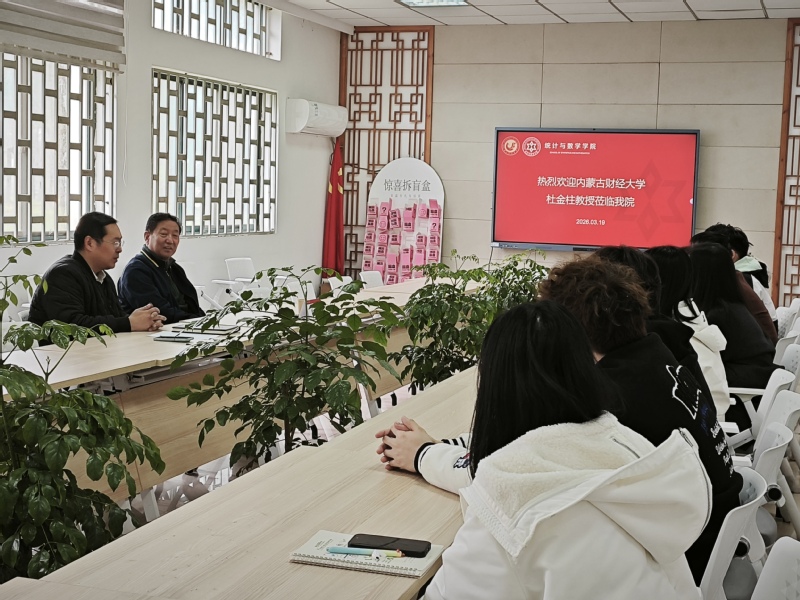 3月19日,内蒙古财经大学原校长杜金柱教授应邀莅临我院访问交流。院党总支书记王华、副院长王磊陪同杜金柱教授实地参观了学院教学科研场所,并召开了座谈交流会。统计系骨干教师及应用统计全体研究生参会。