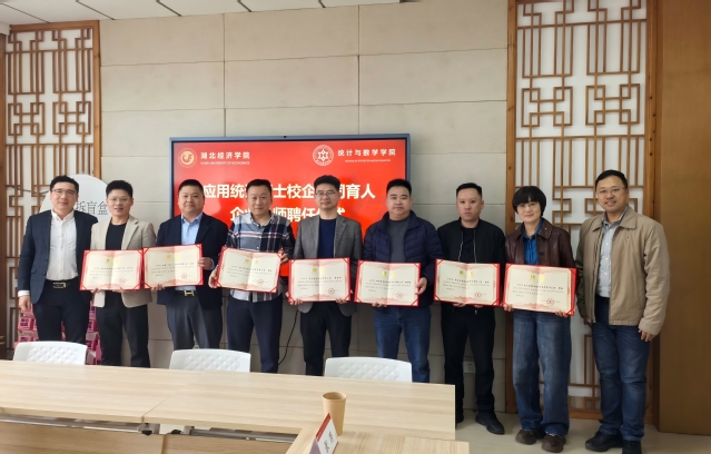 活动中,王磊副院长宣读了受聘企业硕士生导师名单。张志刚院长为曹敏(武汉先锋市场策划有限责任公司总经理)、陈杰(武汉奥普铭市场研究有限公司总经理)、侯升健(湖北维度统计师事务所有限公司总经理)、胡意顺(武汉楚珈科技有限公司总经理)、潘文(武汉恒诺市场研究有限公司总经理)、庞昊(立信〔武汉〕数据科技有限公司总经理)、田代平(泰迪智能科技〔武汉〕有限公司总经理)等7位受聘企业硕士生导师颁发聘书并合影留念。受聘导师分别来自市场研究、统计服务、数据科技、智能科技等相关领域,具有较为丰富的行业实践经验。