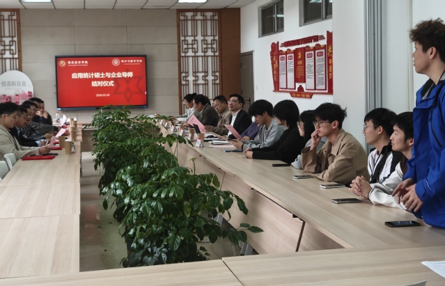 在专硕联合培养结对仪式环节,7名应用统计专业硕士研究生依次进行了自我介绍,并与对应企业硕士生导师见面亮相。学院领导、企业导师和研究生共同合影留念,标志着学院应用统计专业硕士校企协同联合培养工作正式启动。